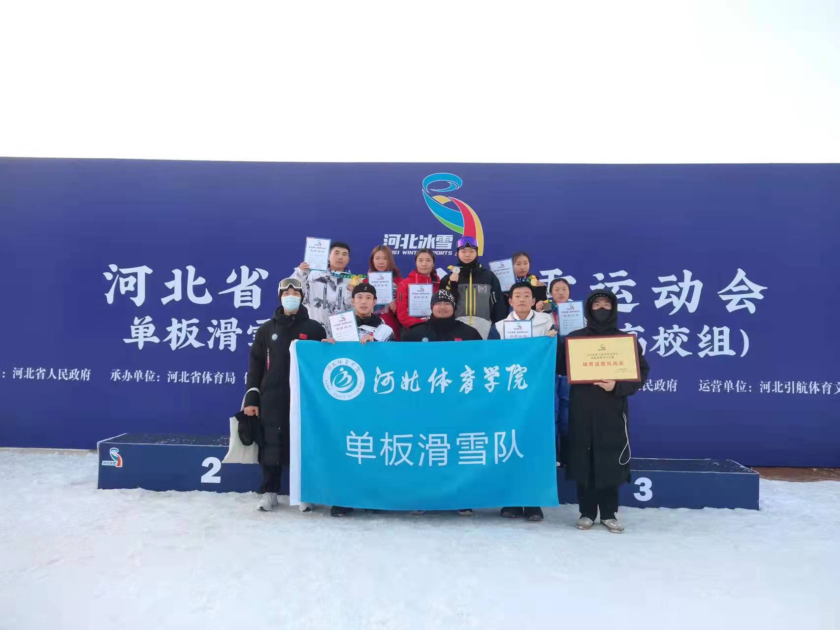 2021年12月9日,河北省第三届冰雪运动会开赛第七日,我系在本日比赛中斩获2金2银1铜。河北体育学院包揽单板滑雪平行大回转项目高校女子组前四名。 在高校组女子单板滑雪平行回转项目比赛中,我系单板滑雪代表队傅洁斩获冠军,朱桂羽获得亚军,谌业美获得季军,弋国莉获得第四名。 在高校组男子单板滑雪平行回转项目比赛中,全骏正夺得冠军,赵泽阳获得亚军,陈涛获得第四名,王桢尧获得第五名。