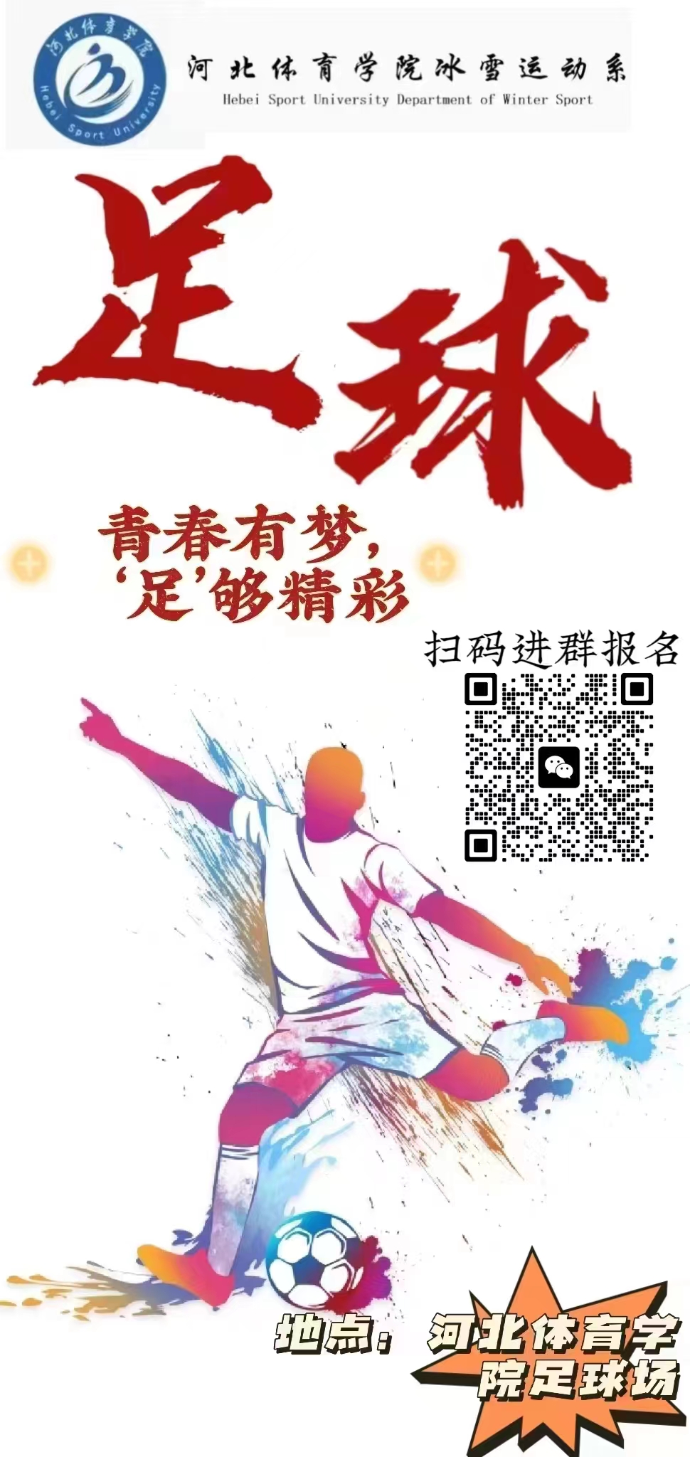 一、活动背景 促进全系学生之间的沟通交流,丰富广大学生的课余生活,同时培养同学们顽强奋斗、勇于拼搏的优良品质与团队意识、团队精神,并推动我系足球运动的发展,以友谊推动比赛,以比赛促进交流,以交流带动进步,把握机遇,展现自我,释放青春与活力! 二、活动目的 为进一步丰富我系学生对足球运动的兴趣,培养学生团结协作能力,提高团队意识,努力拼搏精神和集体荣誉感。并体现足球运动的可参与性和趣味性,促进和谐校园和校园文化,活跃校园气氛,努力营造一个宽松,愉悦,和谐的比赛氛围,冰雪运动系特此举办“青春有梦,‘足’够精彩”足球比赛。 三、活动主题 “青春有梦,‘足’够精彩”足球赛 四、活动对象 冰雪运动系全体在校学生 五、活动时间 2024年5月20日—2024年5月24日 六、活动地点 河北体育学院足球场 七、报名方式 以队为单位于2024年5月9日—2024年5月15日由各队领队进入冀体冰雪公众号扫描二维码进入赛事交流群,后自行打印报名表和免责协议到冰雪运动系系办公室124交于赛事负责人王俣。(联系电话:18182081854)