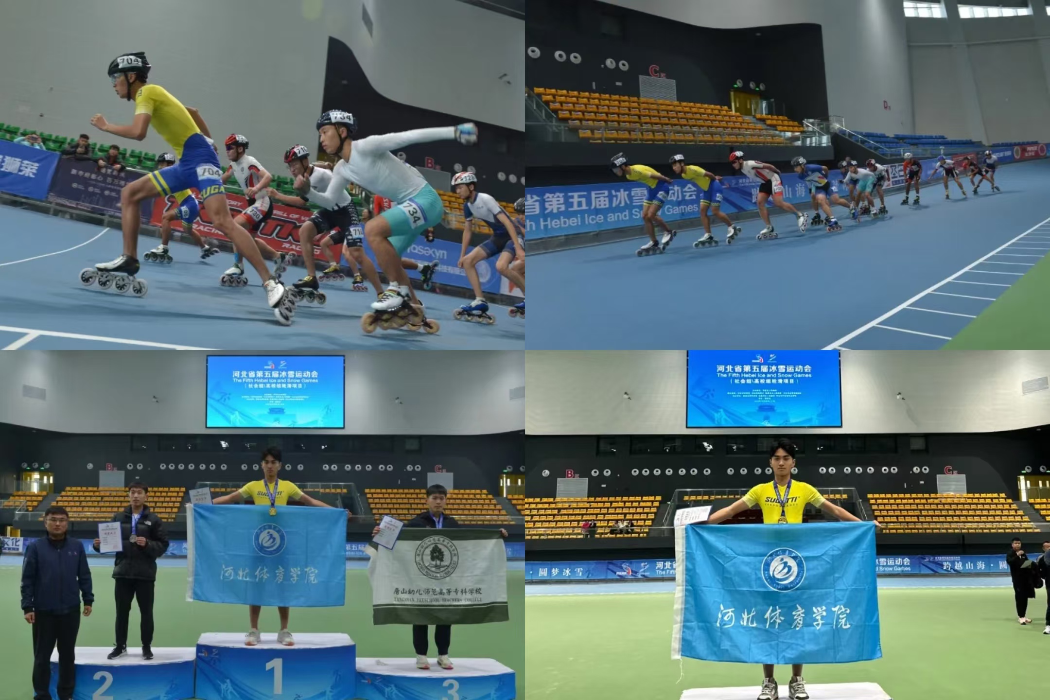 河北体育学院派出了由10名运动员组成的代表队,全面参与了轮滑项目的6个小项比赛。在为期三天的激烈角逐中,河北体育学院速度轮滑队展现出了强大的竞技实力,共计夺得2枚金牌、1枚银牌、2枚铜牌,并以团体总分第一名的优异成绩傲视群雄。其中,2023级冰雪训练张轩硕一人独揽男子1000米计时赛和5000米淘汰赛两枚金牌,2021级休闲体育(3+4)闫华溢获得男子500米争先赛银牌,2022级休闲体育(3+4)靳沛获得男子500米争先赛铜牌,2023级冰雪训练梁昌民获得女子500米争先赛铜牌。